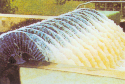 为了减少氧化沟曝气池的占地面积,节省城市土地资源,减少氧化沟污水厂的建设投资,我公司经过多年的研究和总结,在原曝气转碟的基础上进行了重大改进。将碟片的原有两侧充氧推流改成立体三维充氧和推流,这样可使推流能力和充氧能力大大提高,适用水深可从原来的4.5米提高到5.5米,使氧化沟工艺的突破性发展变成了事实,并适用于瞬间高密度供氧,长距离推流的缺氧段和好氧段的推流和充氧,节省了水下推进器,减少了能耗和投资。可替代倒伞形曝气机,增加推流能力,同比节电25%