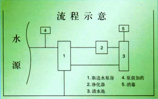 2、当水源距水厂较近时,取水泵房可与送水泵房合并,采用如右图流程。当水源距水厂较远时,取水、净化设施分建,流程视当地具体情况布局。